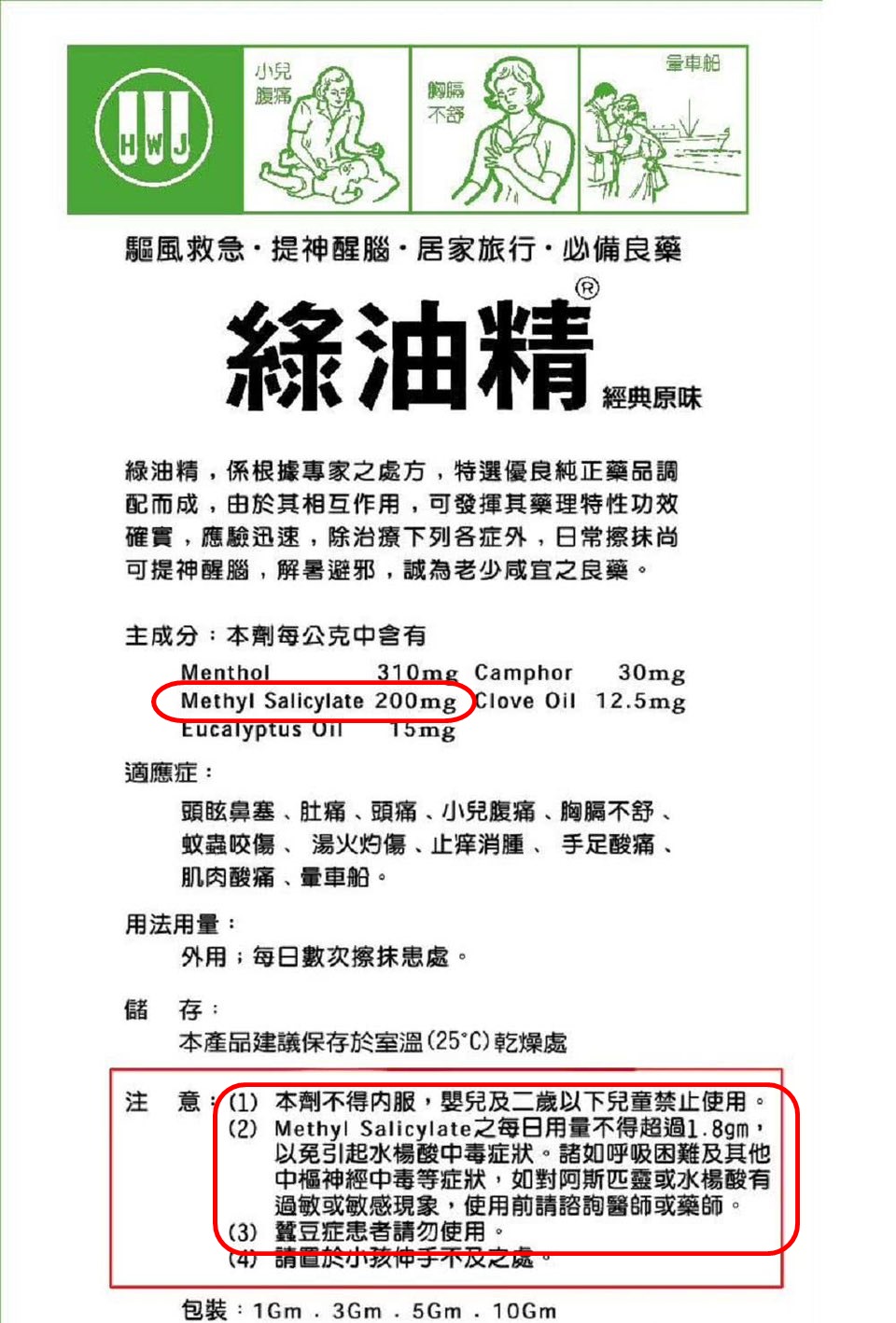 再舉個例來講,大家都使用過的綠油精,也是 1 g 中含有 水楊酸甲酯(Methyl salicylate) 200mg!