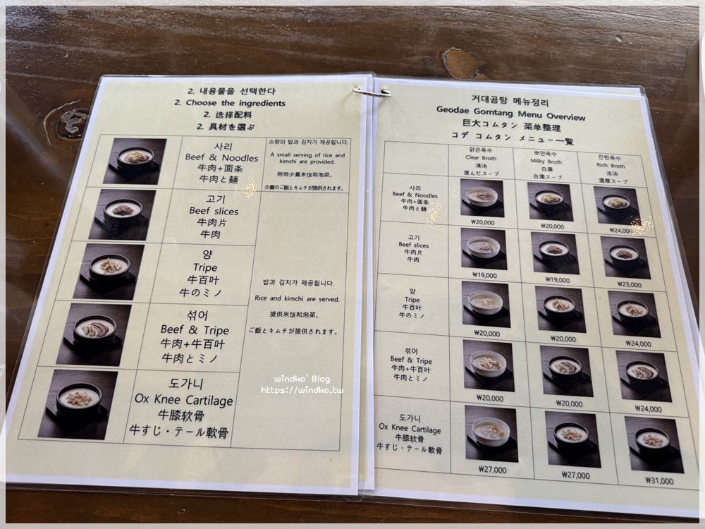 簡單來說就是--所有的湯類品項都可以做三種湯頭,濃湯比清湯多了 4000KRW。