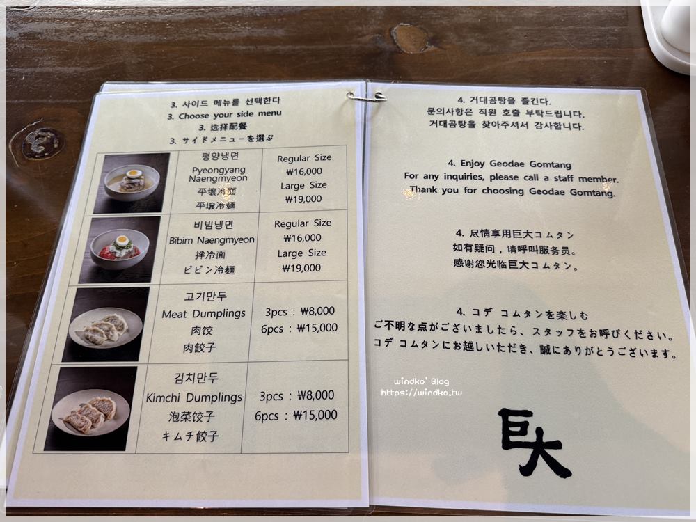 姨母很貼心地送來中文菜單!上頭有中韓英日,四種語言介紹得很清楚。
