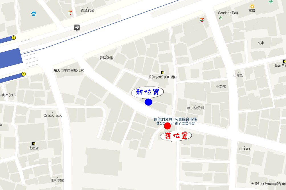 下方是之前的舊店面,它是在 2025 年中時搬家的,就是搬到斜對面而已,反正從東大門站走昌信洞玩具街入口進來,很快就會看到它了。