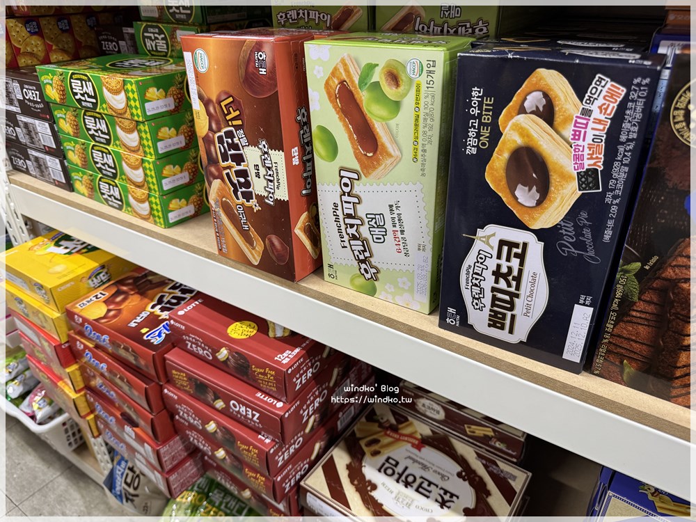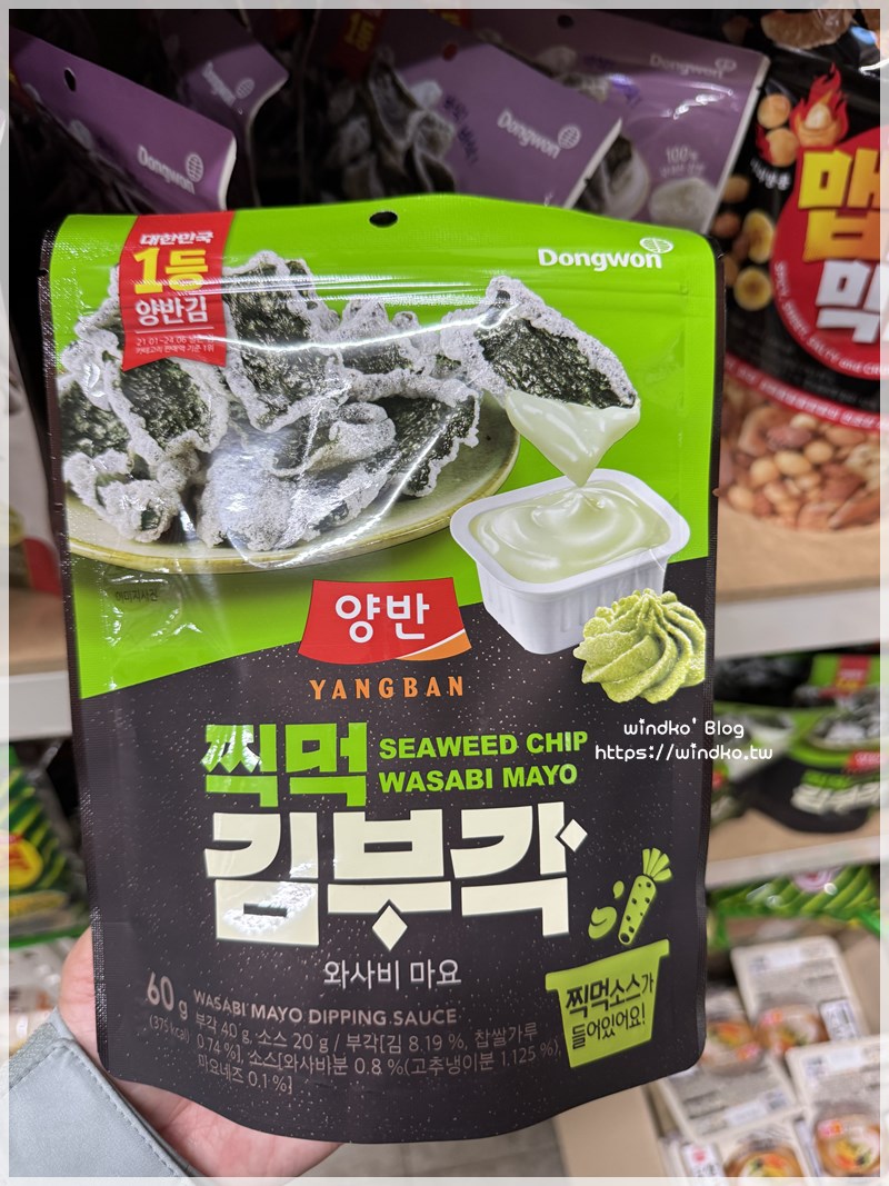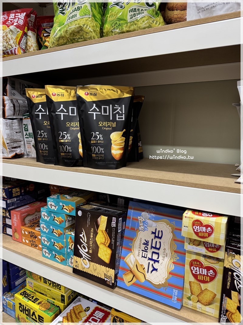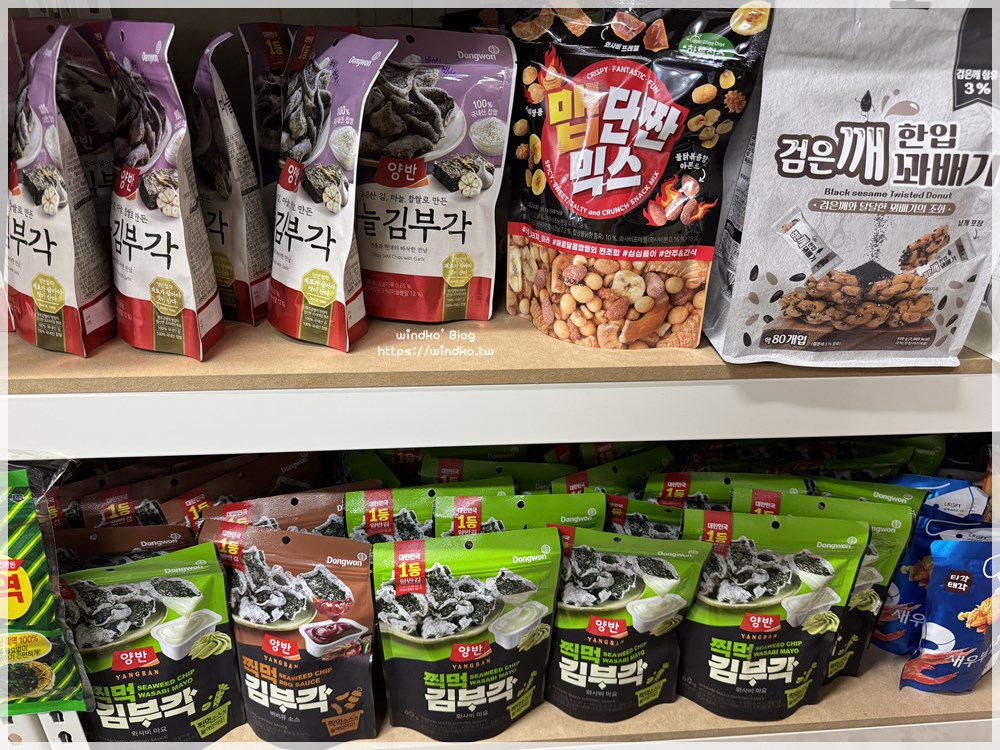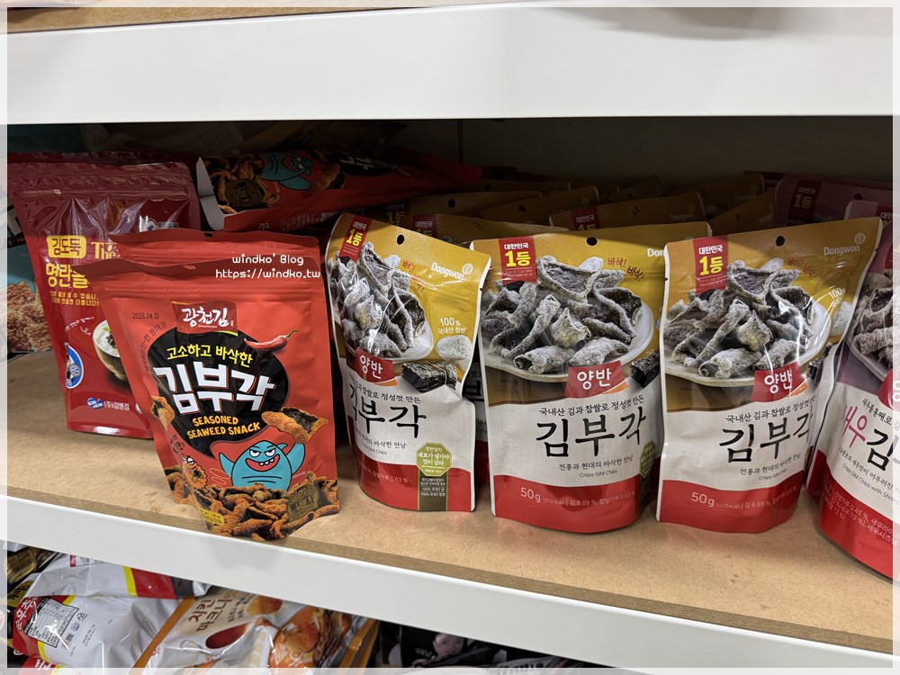 我印象最深刻之一的是右下明太子海苔酥,這裡賣一包 1000KRW,後來我在其它地方看到是賣 1400~1500KRW 之間,哇價差很大耶。