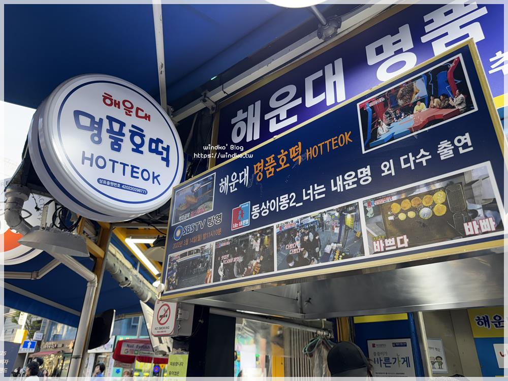 前方左邊有個白色圓型的招牌就是海雲台名品糖餅(해운대명품호떡)。