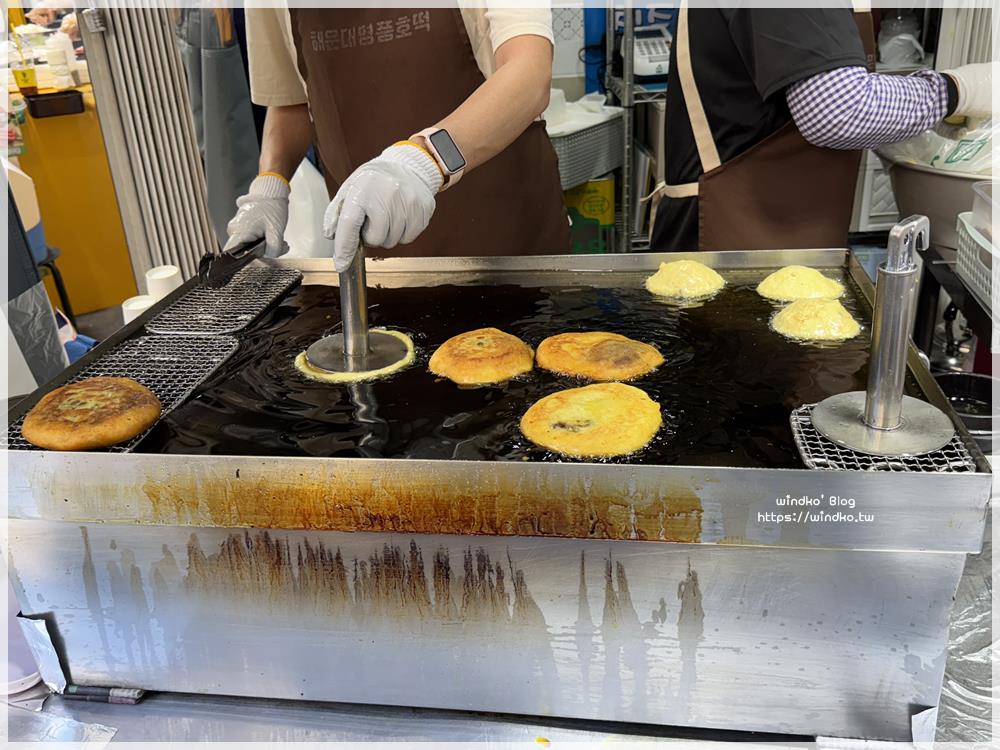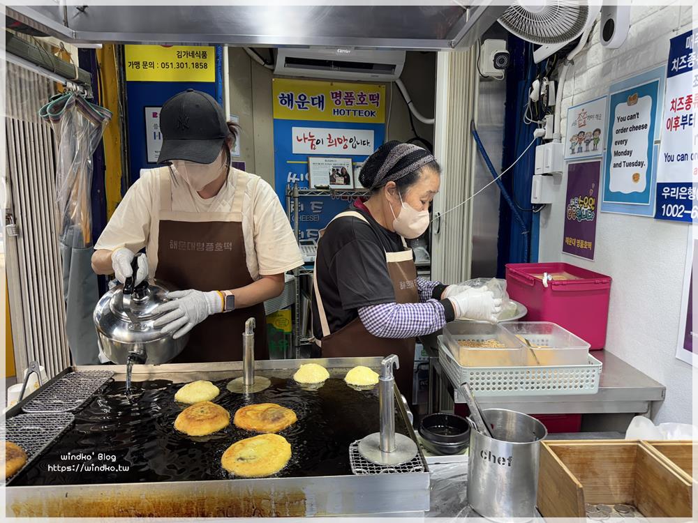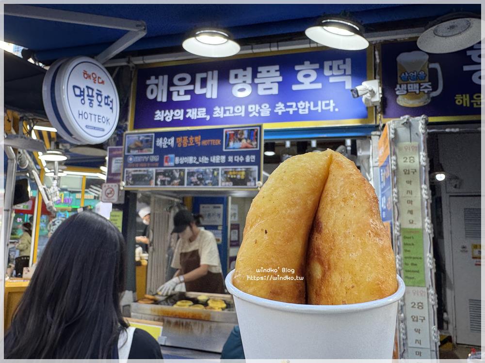 每次經過海雲台市場,都會看到入口旁的海雲台名品糖餅(해운대명품호떡)似乎總是有人在排隊!這次終於停下腳步跟著排隊買來吃看看啦。