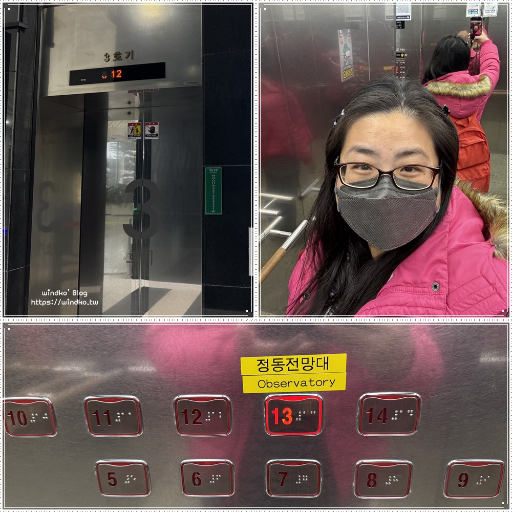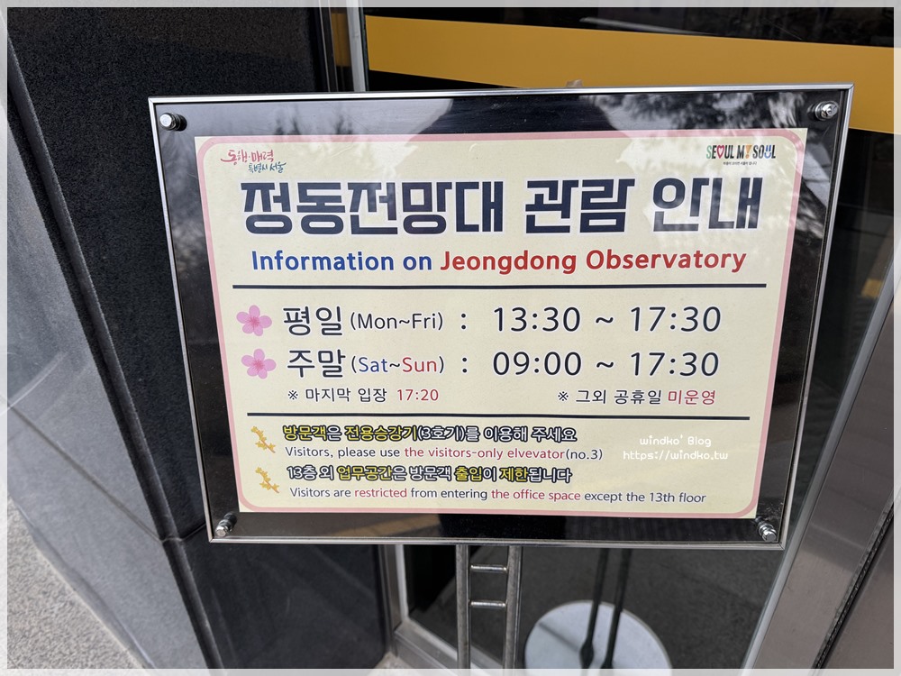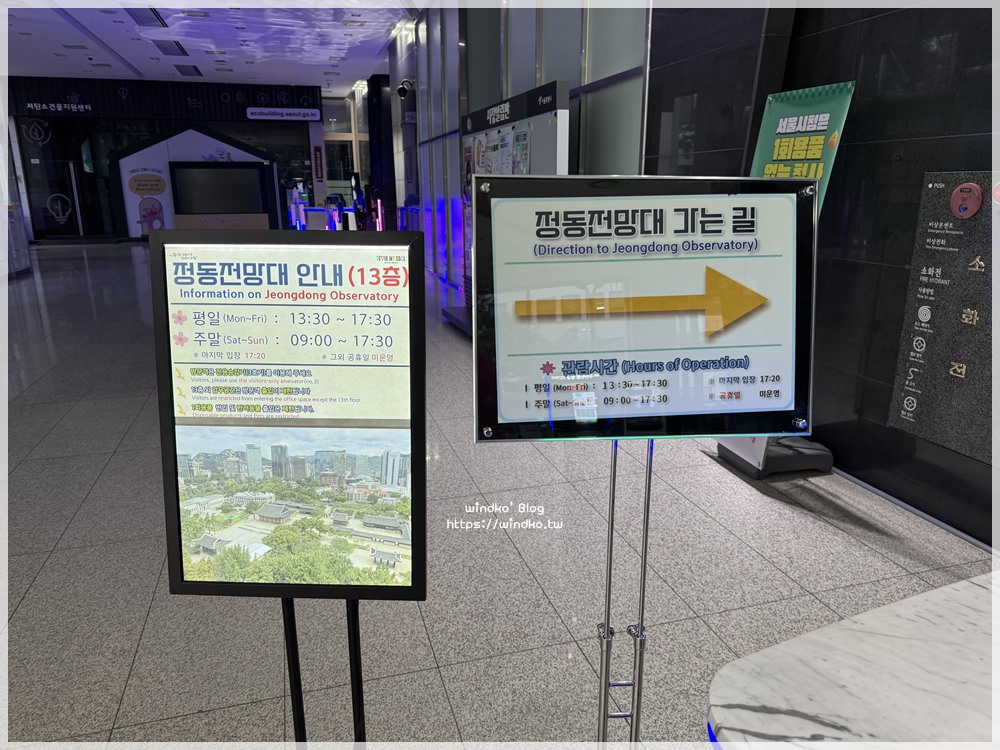 貞洞展望台位在市廳站 12 號出口旁的西小門(서소문)大樓13樓,也就是在德壽宮的石牆路旁。進到西小門大樓以後,搭電梯直達 13 樓。