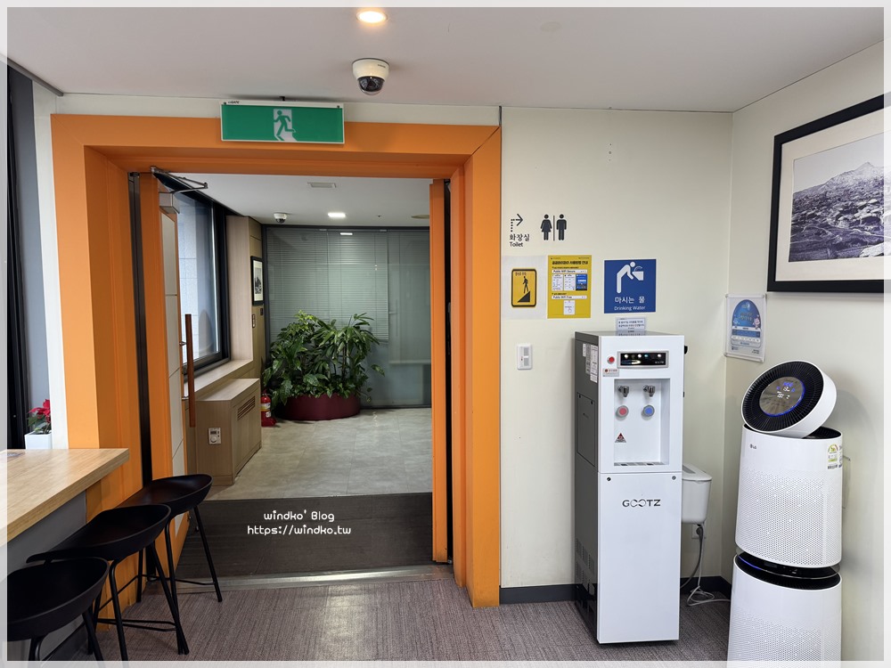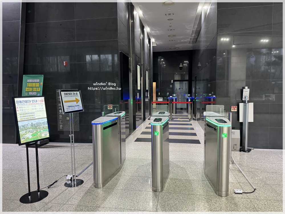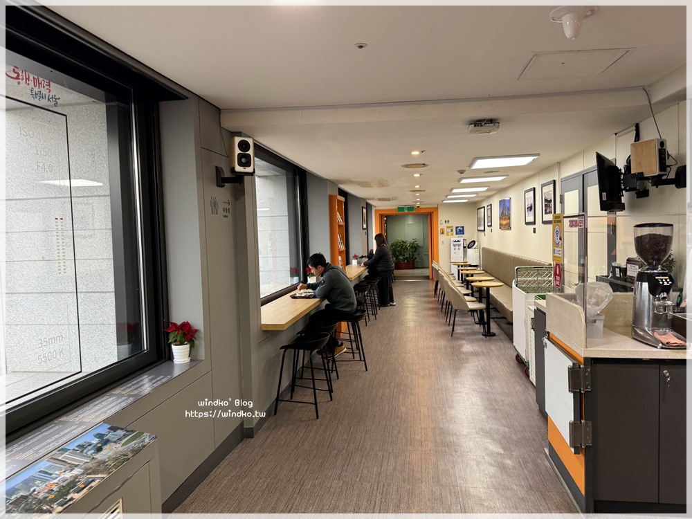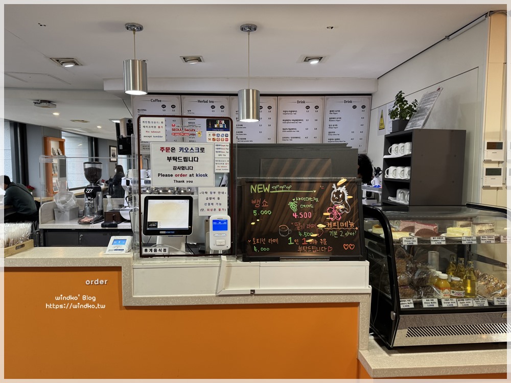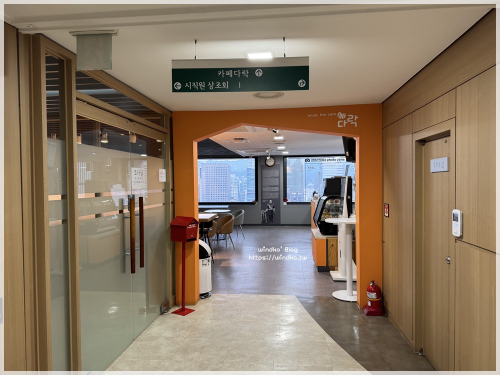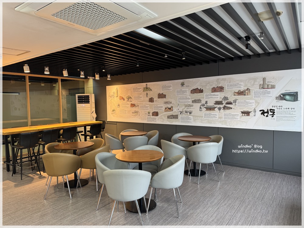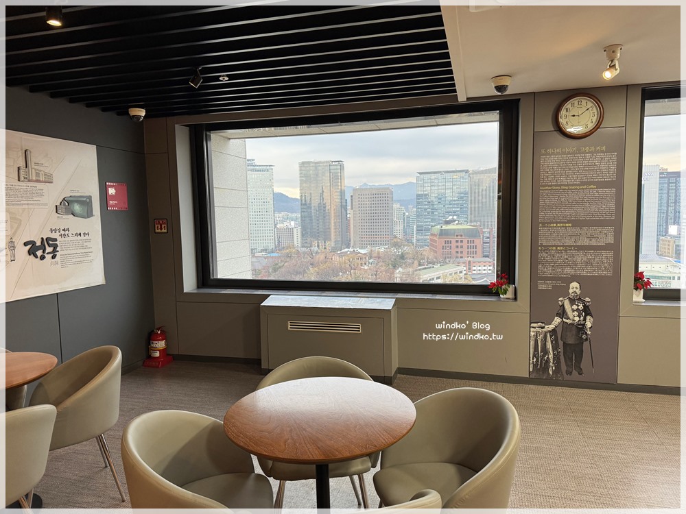 會先經過一個小小的廳堂,牆面有介紹貞洞與週邊景點。右邊是咖啡廳的櫃台,價位算是滿平價,可以點一杯咖啡享受高空的咖啡廳感覺。(笑)。