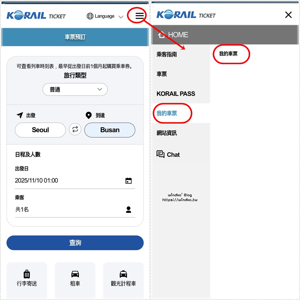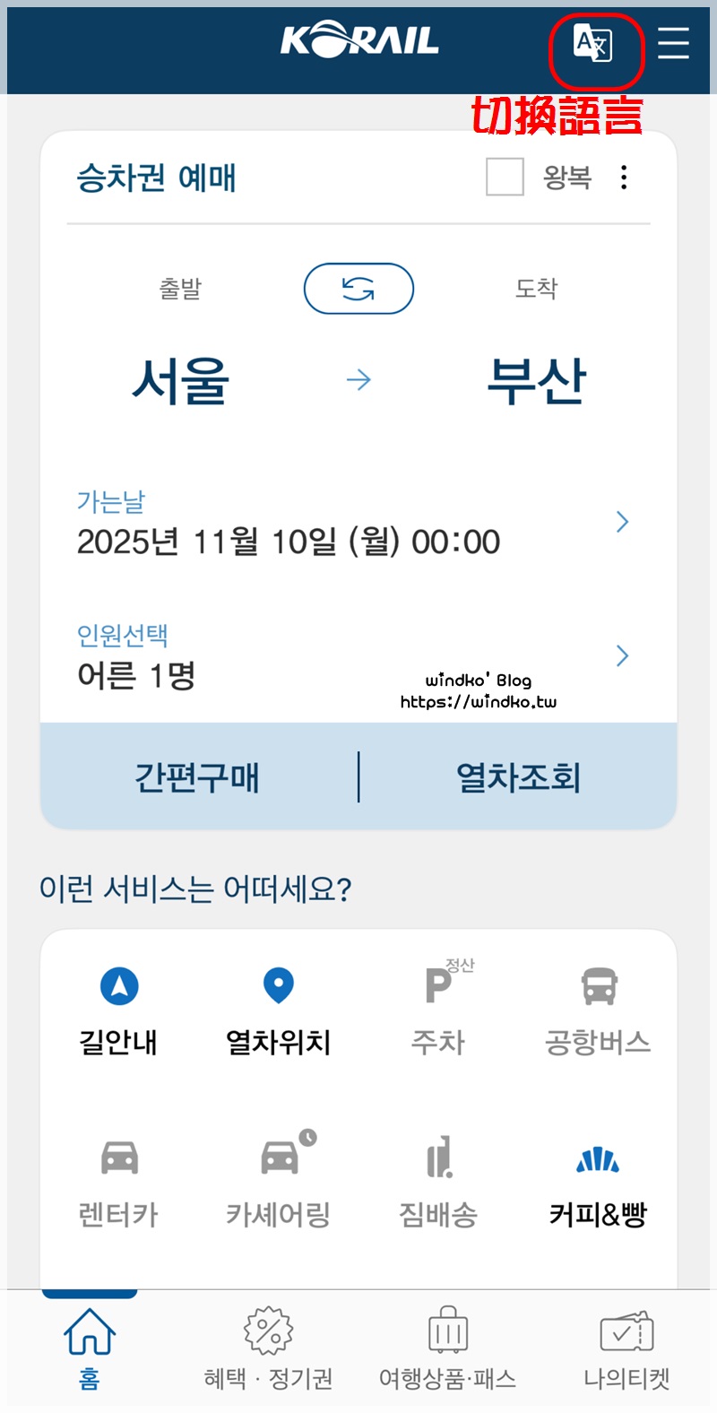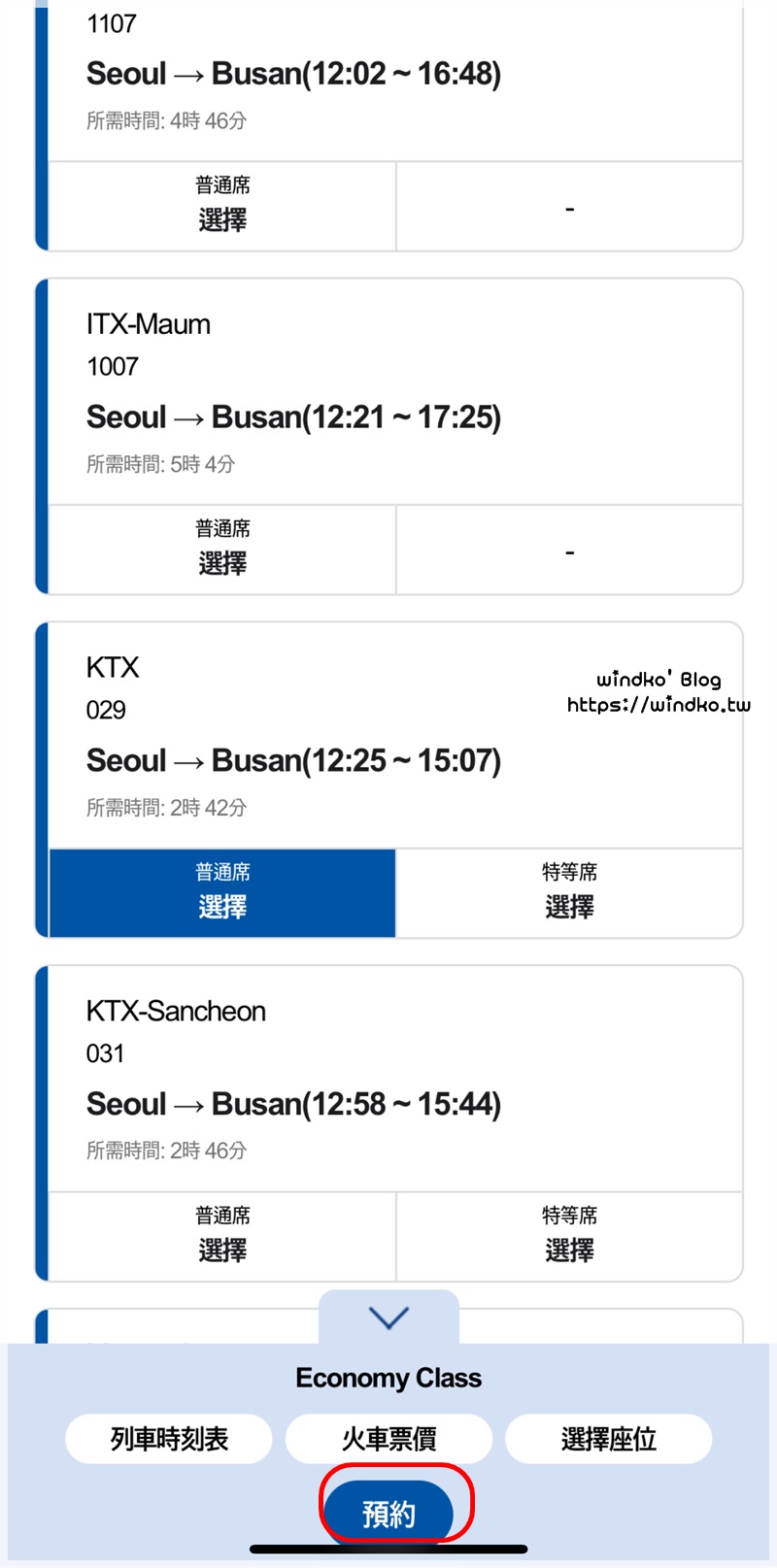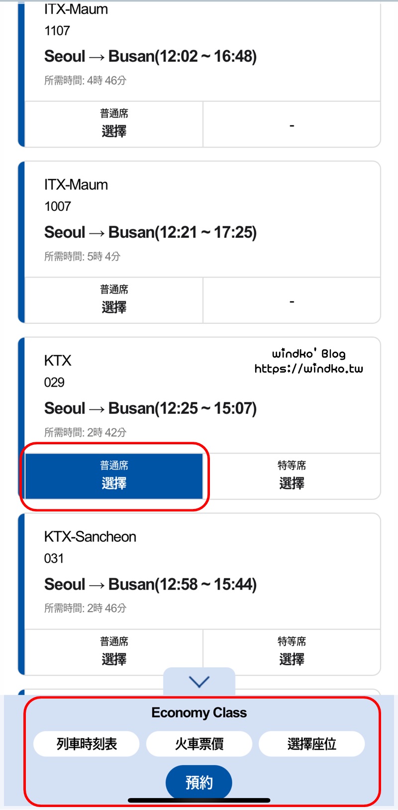 以下,windko 是使用 APP 為例,預訂 KTX 車票的過程截圖。