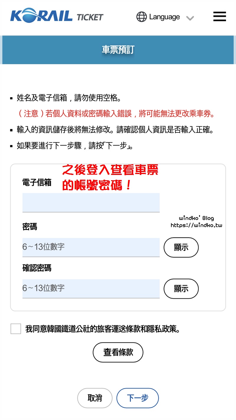 輸入個人資料、預訂車票