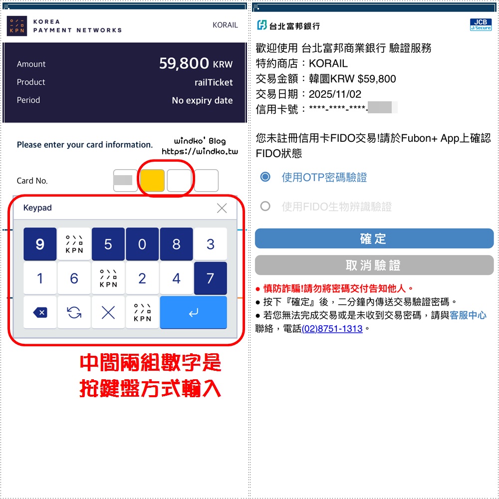 在輸入信用卡號碼時,中間兩組數字不是使用自己的鍵盤按,而是需要使用系統彈出的小鍵盤,數字符號會隨機分布,從中點選你卡片的數字。