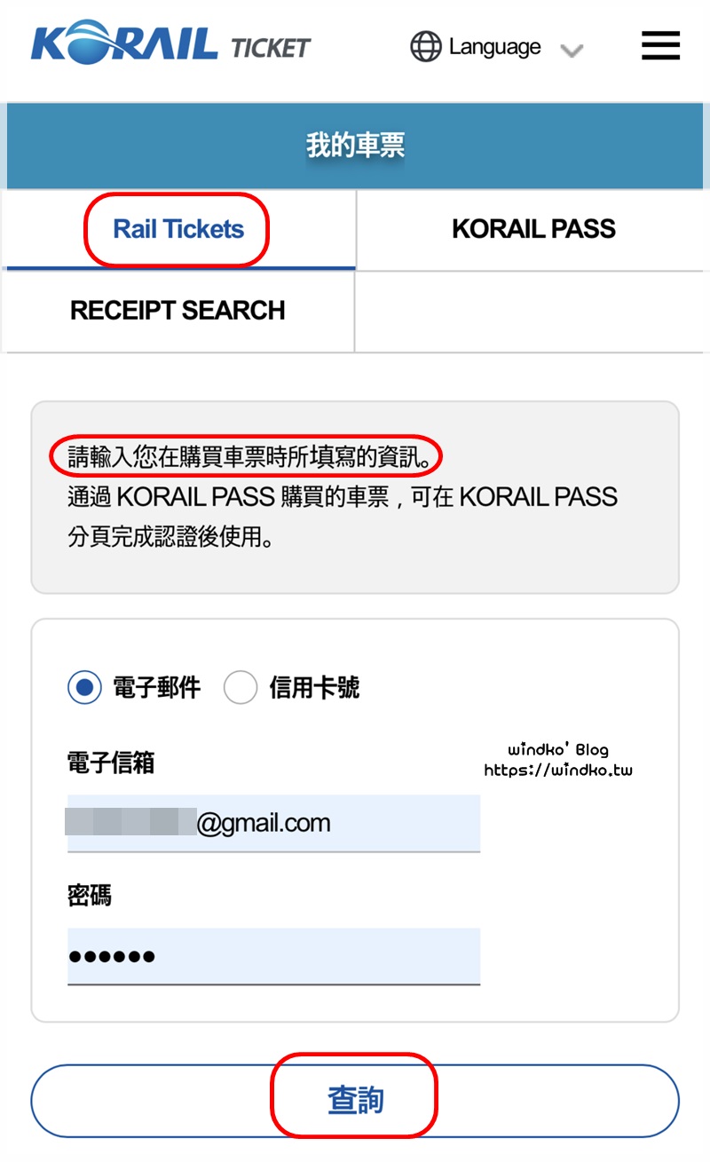接著輸入訂票時設定的登入帳號(信箱)、密碼(數字),即可查詢自己所預訂的車票。