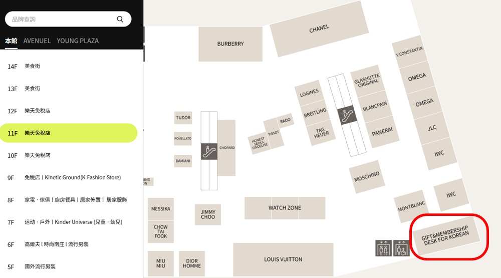 先附上明洞樂天免稅店 11 樓的樓層配置圖,讓你可以最快速度找到櫃台。