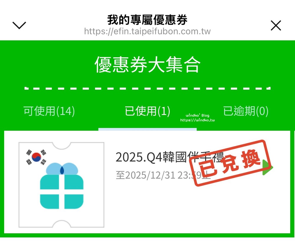 3.台北富邦銀行 LINE 官方帳號裡的韓國伴手禮兌換券。