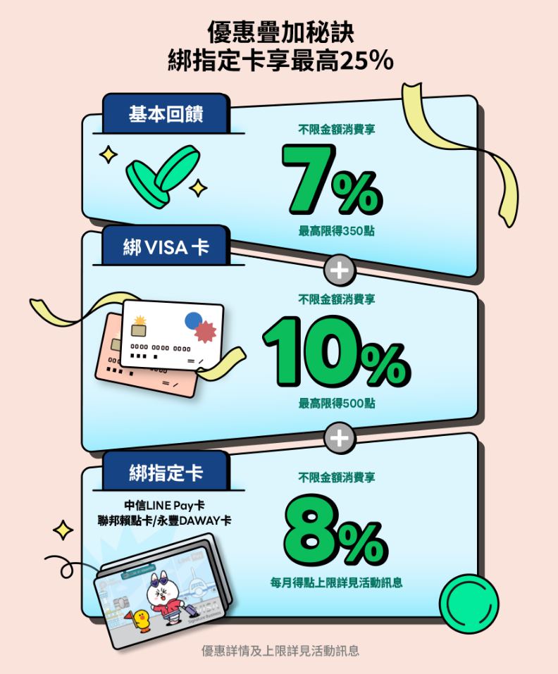 例如我如果用 LINE PAY 綁中信 LINE PAY VISA 卡,就是 7+10+8= 25% 回饋!