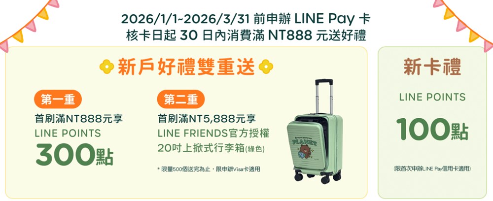 優惠一:每LINE Pay帳號每月最高限得1,000點。每月限量160萬點,發完為止。