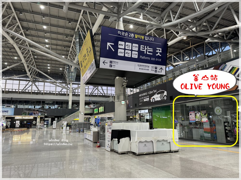 下方照片是之前在釜山 KTX 站第一班車北上時所拍,凌晨五點,大家都還沒開門,但可以清楚地看到 OLIVE YOUNG 就位在車站大廳 XD