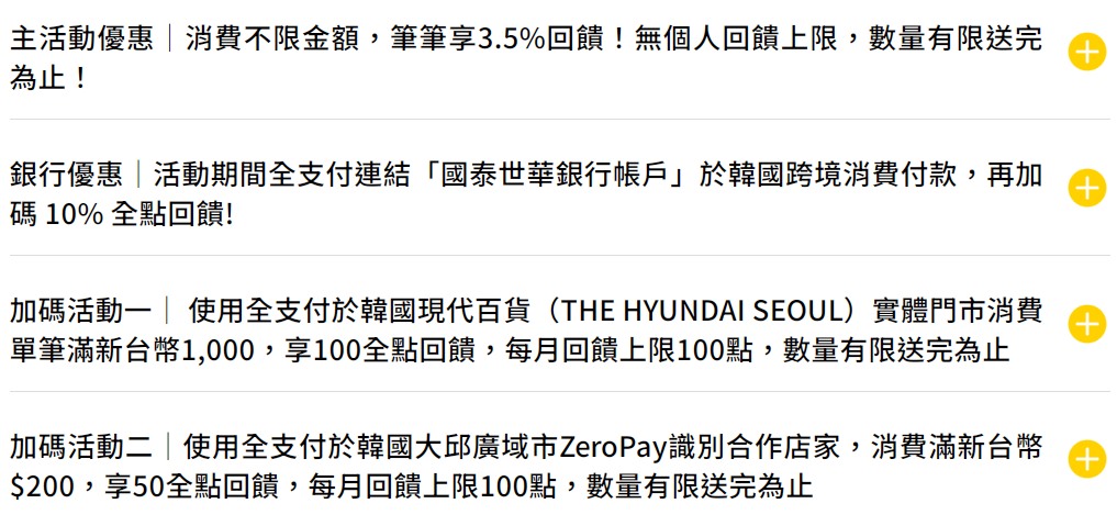 重點是:9/30 以前,全支付在韓國消費有基本 3.5% 全點回饋,回饋無上限!另外還免收 1.5% 國外交易手續費!如果你綁指定銀行帳戶再加碼 10% 全點回饋唷!