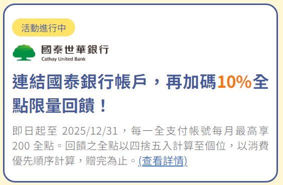 銀行優惠|活動期間全支付連結「國泰世華銀行帳戶」於韓國跨境消費付款,再加碼 10% 全點回饋!