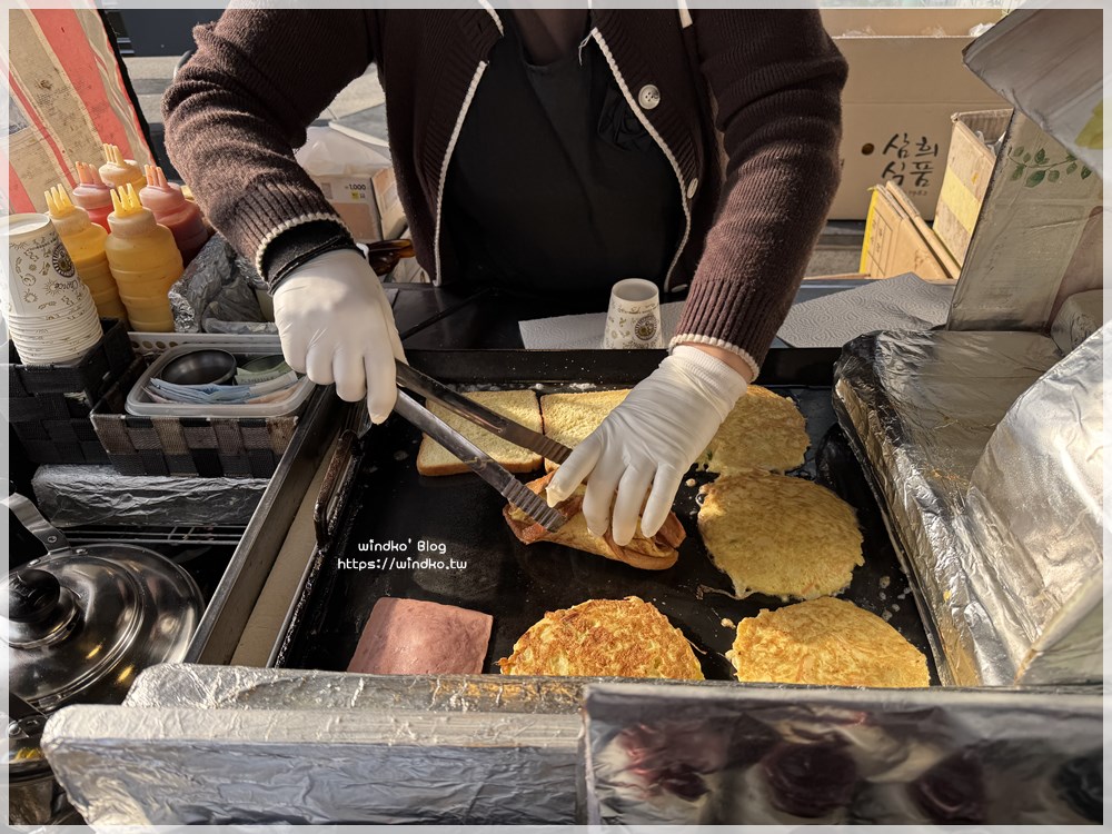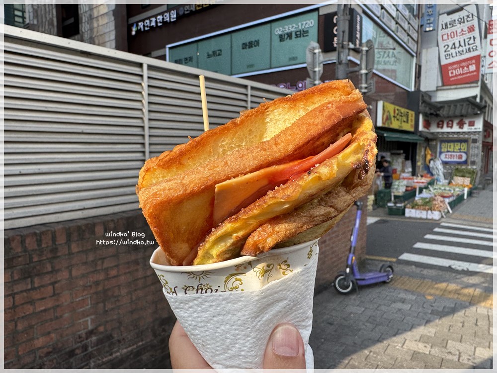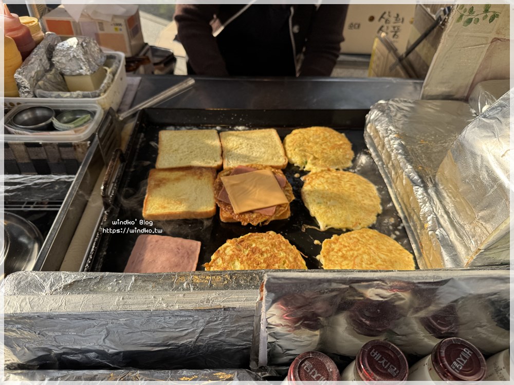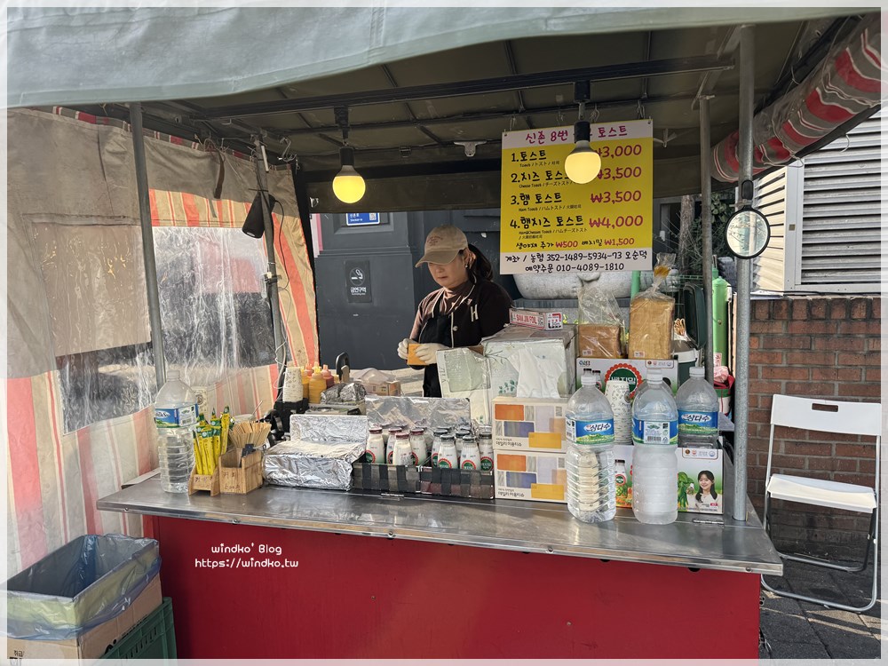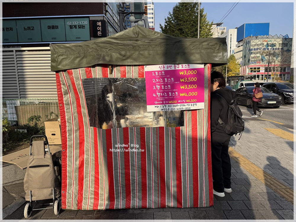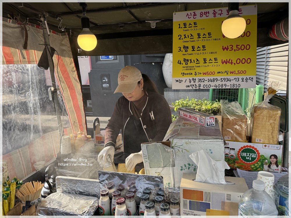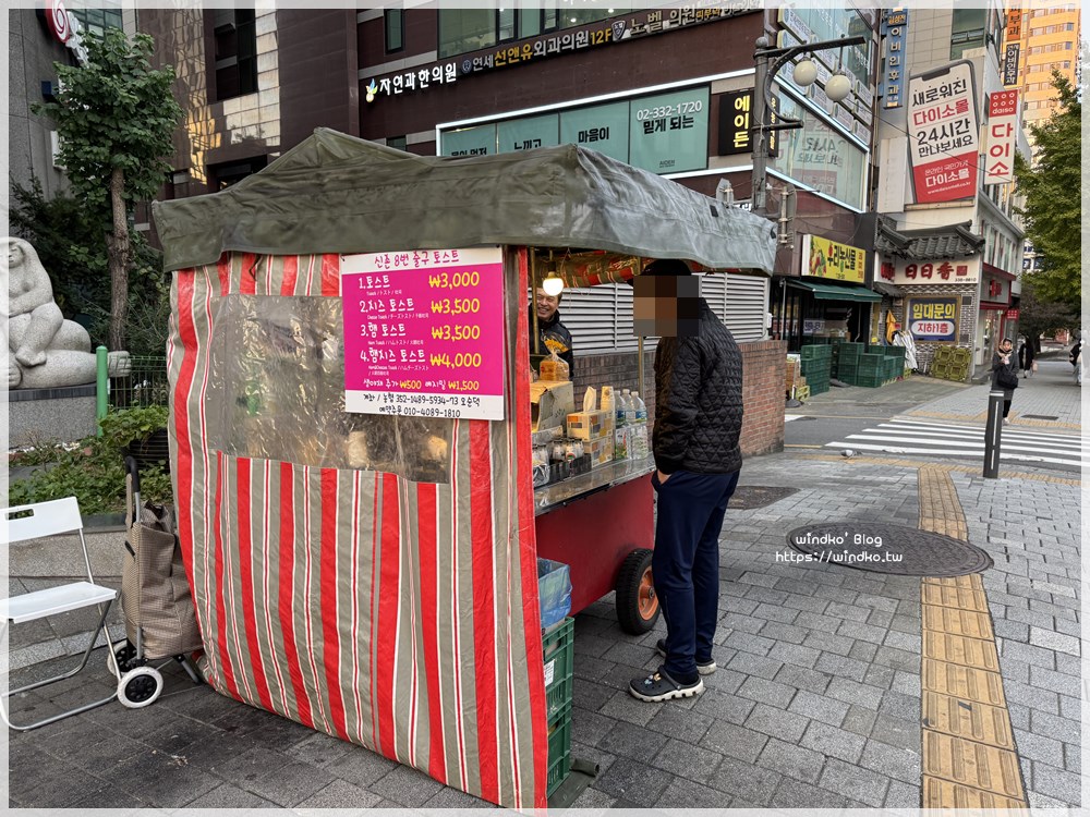 這三次玩首爾都住在新村站附近,早上在新村站 8 號出口搭公車或是下去搭地鐵的話,一定都會經過這家吐司攤!而且每次經過都會遇到有客人在買吐司耶,看了下價錢也不貴,只需要 3000~4000 KRW 就可以簡單解決早餐,就想著改天也來試試看。