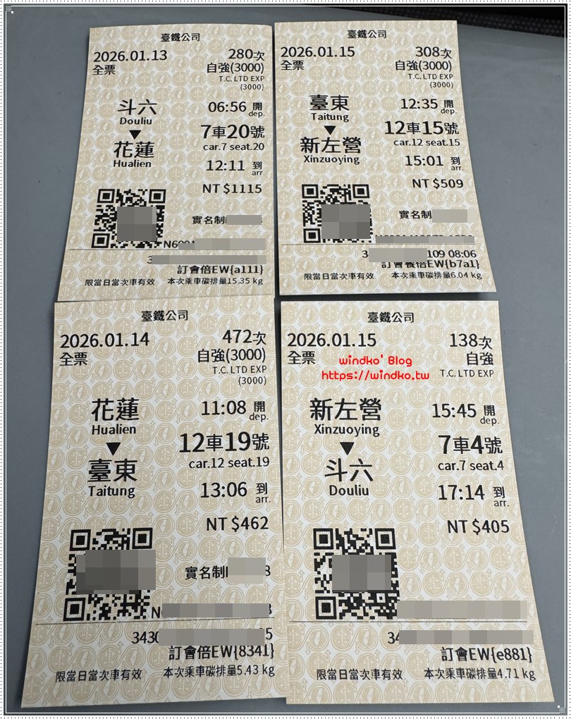 總共買了四段車票:斗六到花蓮、花蓮到台東、台東到新左營、新左營到斗六。