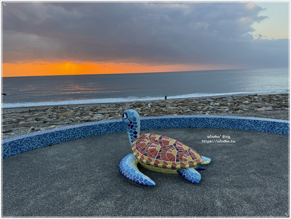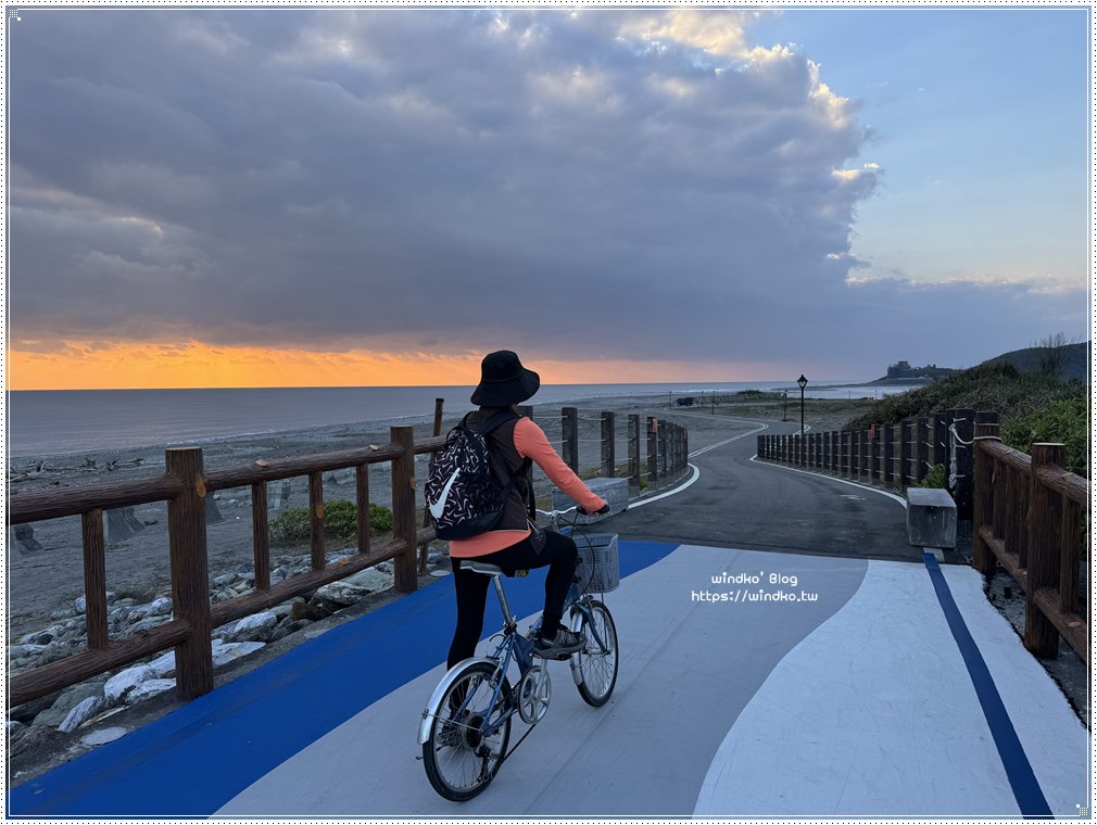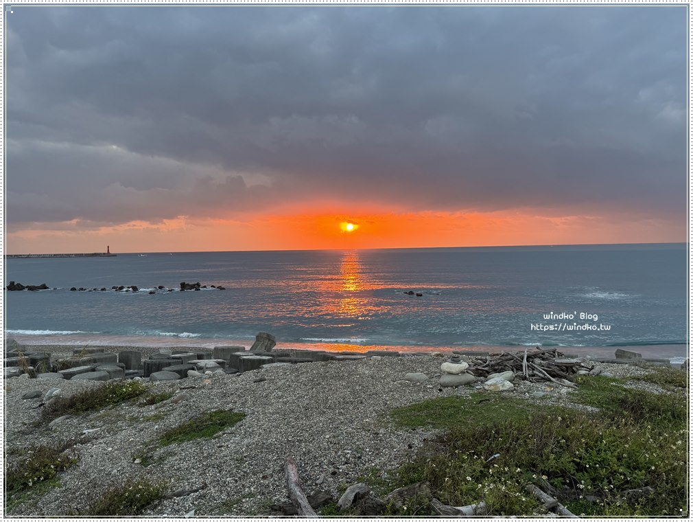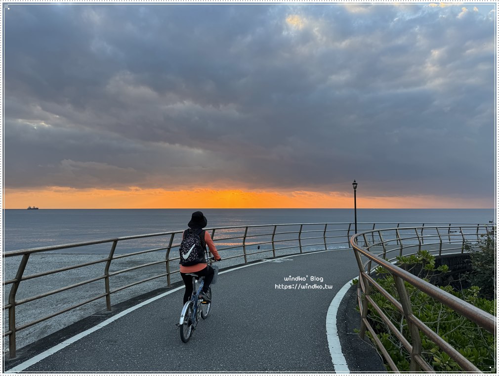我們騎到海邊是六點五十分,剛好看到太陽穿越雲層露臉!不是真正的日出,但至少拍到了偽日出。(笑)
