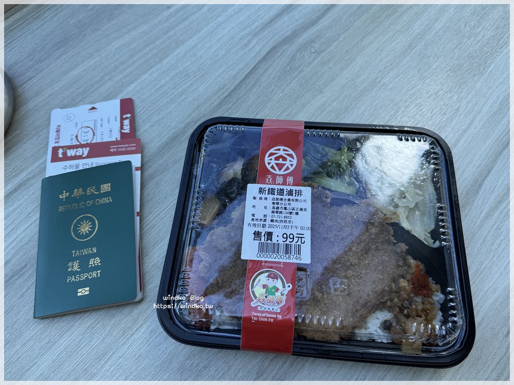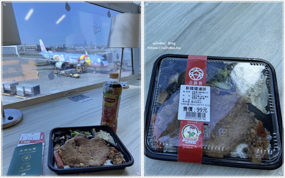 之前都是帶簡單的麵包、三角飯糰等食物在出境後的候機大廳吃,但吃久了還是想要有個變化。這次剛好在高雄機場一樓的全家超商發現它有賣𡘙師傅的便當,就帶著便當出境,再配個自動販賣機的飲料,吃飽再搭飛機。